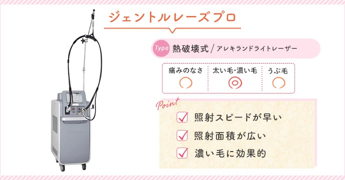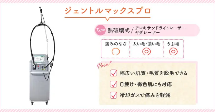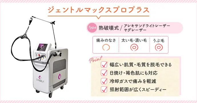 VIOやワキなどの濃くて太い毛に効果の高い「ジェントルレーズ」シリーズや痛みが少なく細い毛に効果の高い「ソプラノチタニウム」を完備!毛質や肌質、部位に合わせて最適な脱毛機を使い分けてくれるので脱毛効果をしっかり実感できる◎